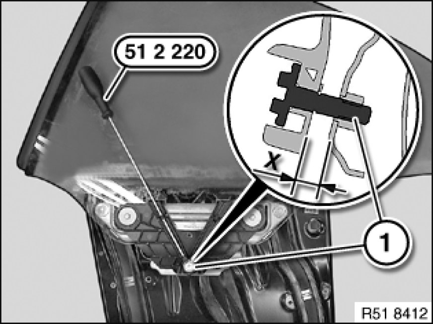 If necessary set dimension (X) with special tool 51 2 220 at screw (1).