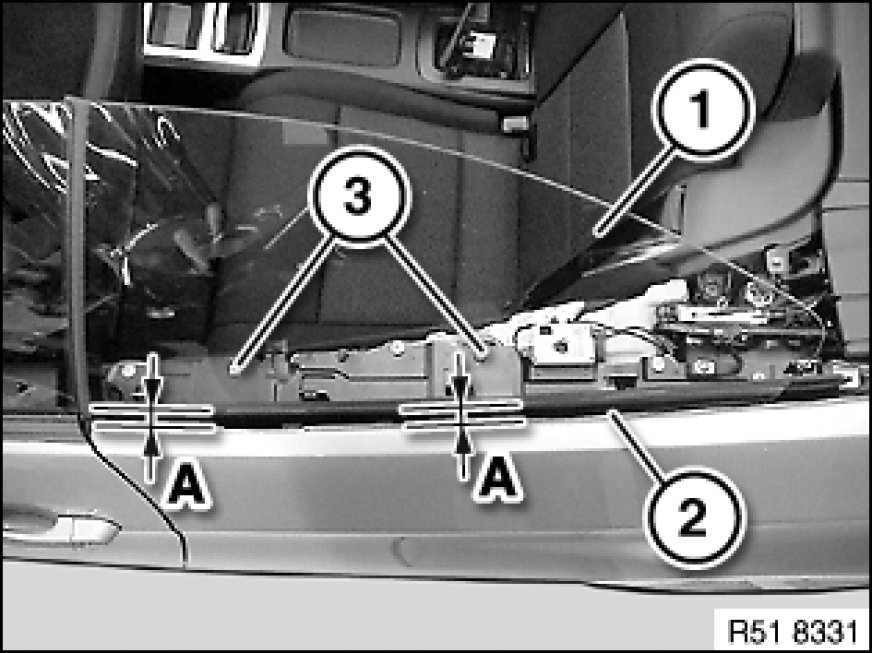 Adjust side window glass (1) in accordance with dimension (A) to body (2).