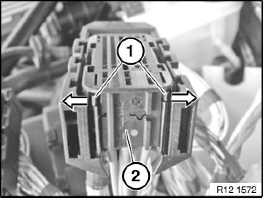 If necessary, press locking tabs (1) in direction of arrow and pull contact carrier (2) out of housing.