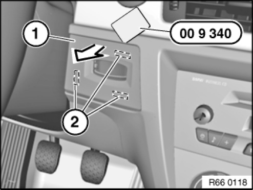 Lift out cover (1) with special tool 00 9 340 at holding points (2) in direction of arrow.