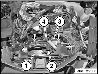 Release tabs in direction of arrow and remove DC/DC converter without additional bracket (3) upward. Disconnect plug connection (4).
