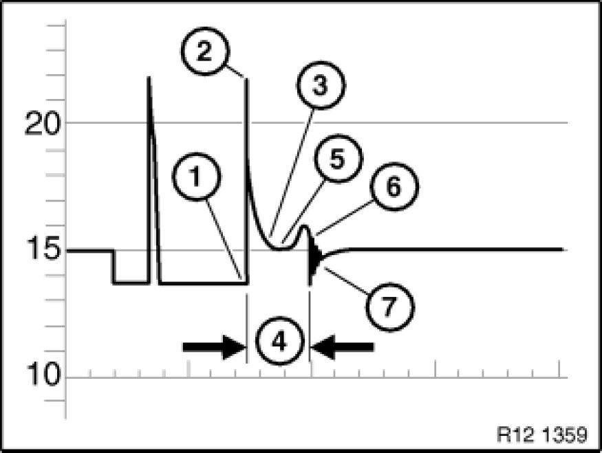 Depending on engine temperature (approx. -20° to 100°) and engine speed (< 2000 rpm.), some ignition voltage peaks (approx. 1-5 ignition peaks) can occur before the typical ignition voltage characteristic.