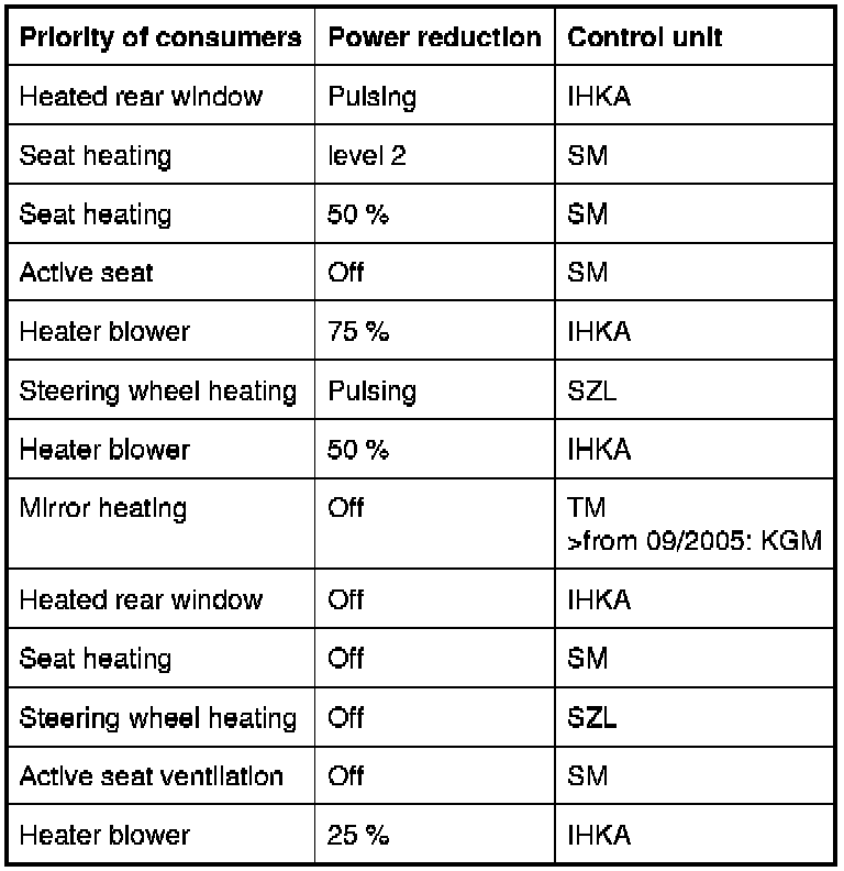 The load on the vehicle electrical system is reduced according to the table:
