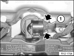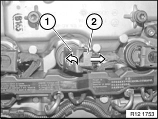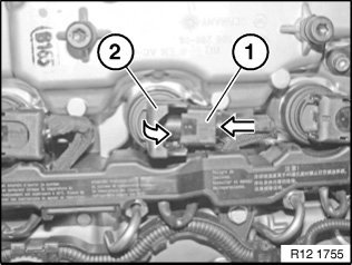 Unlock plug catch (1) on ignition coil (2) and disconnect plug.
