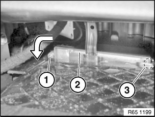 Press airbag control unit (2) in direction of arrow out of rubber mounts (3).