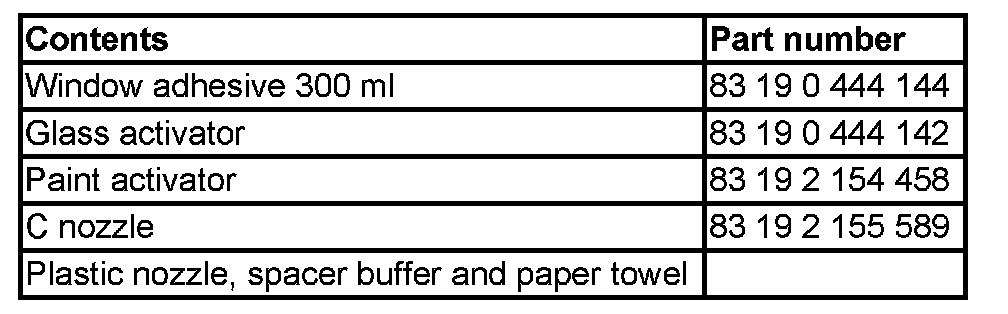 Large repair kit 83 19 0 444 145 contains an additional window glass adhesive 300 ml.