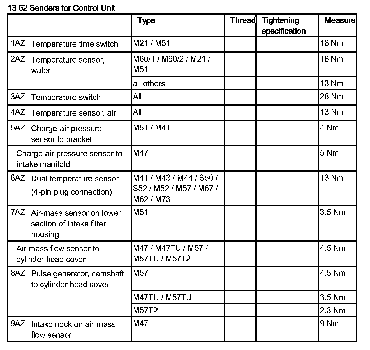 Screws - tightening torque 13 62 8AZ