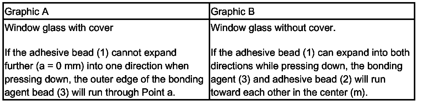 The adhesive bead may become up to 15 mm wide in compressed condition. The width of the adhesion agent is therefore at least 17mm with windscreens and rear windows and at least 9mm with door window glass.