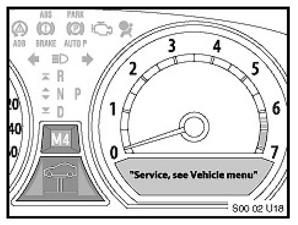 7. Press and hold the Reset Button for a few seconds to display a 2-line menu in the Tachometer. The third menu line will appear to confirm if the reset is successful. The nominal interval for the service item will also be highlighted in the Service Need Display (SBA), located under the Speedometer in the Instrument Cluster.
