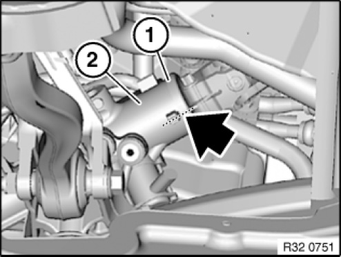 Move steering into straight-ahead driving position by means of markings on cap (1) and steering box (2).