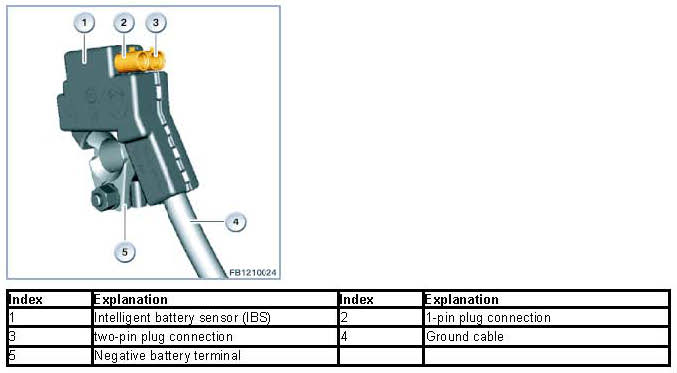 The intelligent battery sensor (IBS) is secured to the negative battery terminal and connected to the Digital Engine Electronics (DME) over the local interconnect network bus.