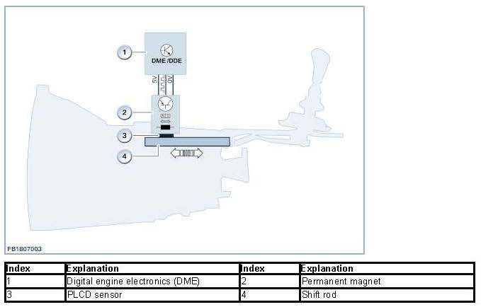 On vehicles with manual transmission, a zero-gear sensor is installed on the top of the transmission housing and has the task of identifying the idle position of the gearshift lever. The zero-gear sensor is a PLCD sensor (Permanent magnetic Linear Contactless Displacement sensor). The gear shift causes the gearshift rod and therefore the magnet in the transmission to move. The Digital Engine Electronics (DME) identifies the position of the gearshift lever from the PLCD sensor. The following distinctions must be made for the automatic engine start-stop: