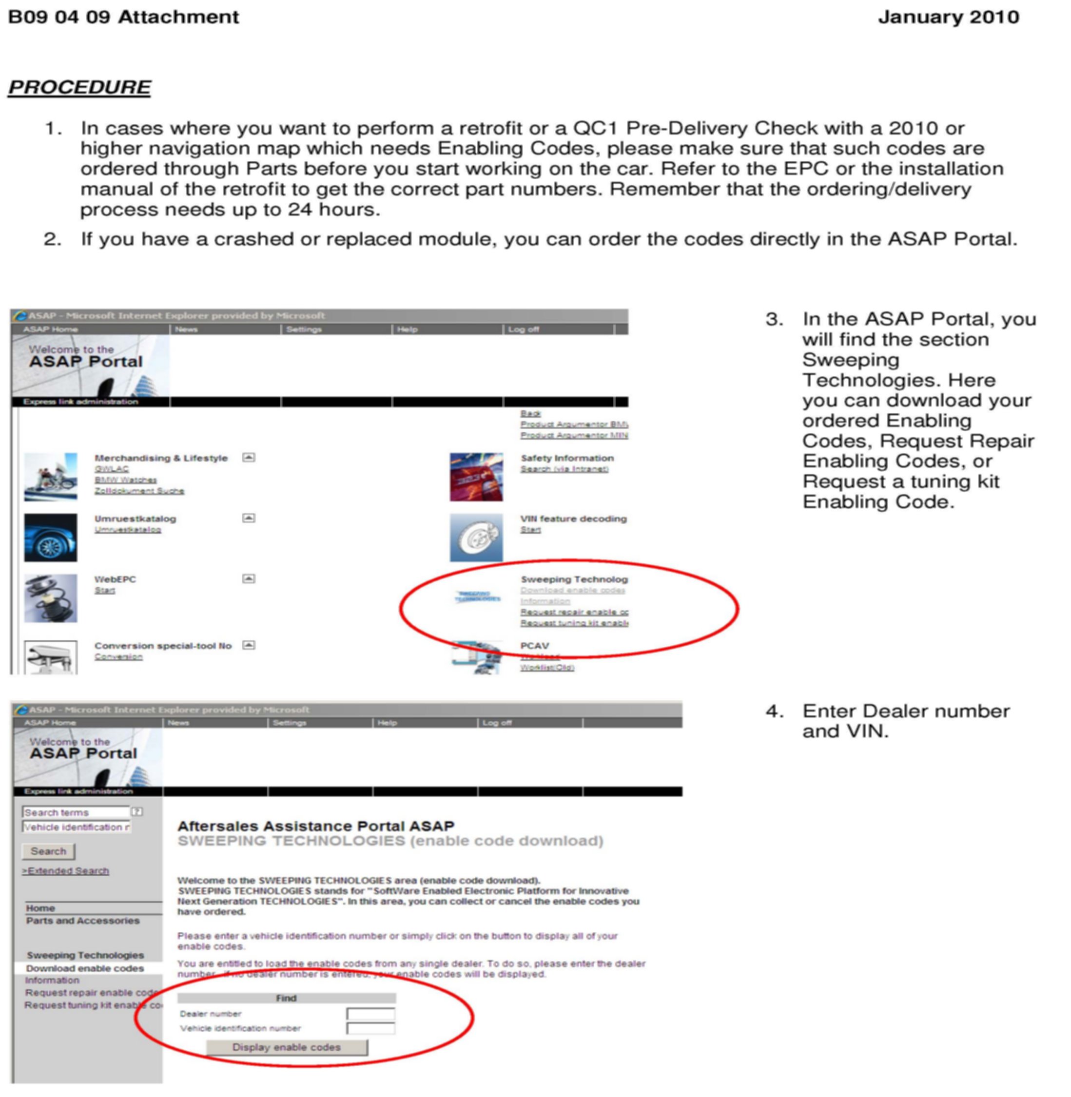 Order the UPDATE Enabling Code for a Navigation Road Map Upgrade (installing a map update): Instructions for obtaining the UPDATE Enabling Code are described in the installation instructions in ASAP (Refer to Parts Information bulletin 65 03 10). Installation is also described in SI B65 38 09.
