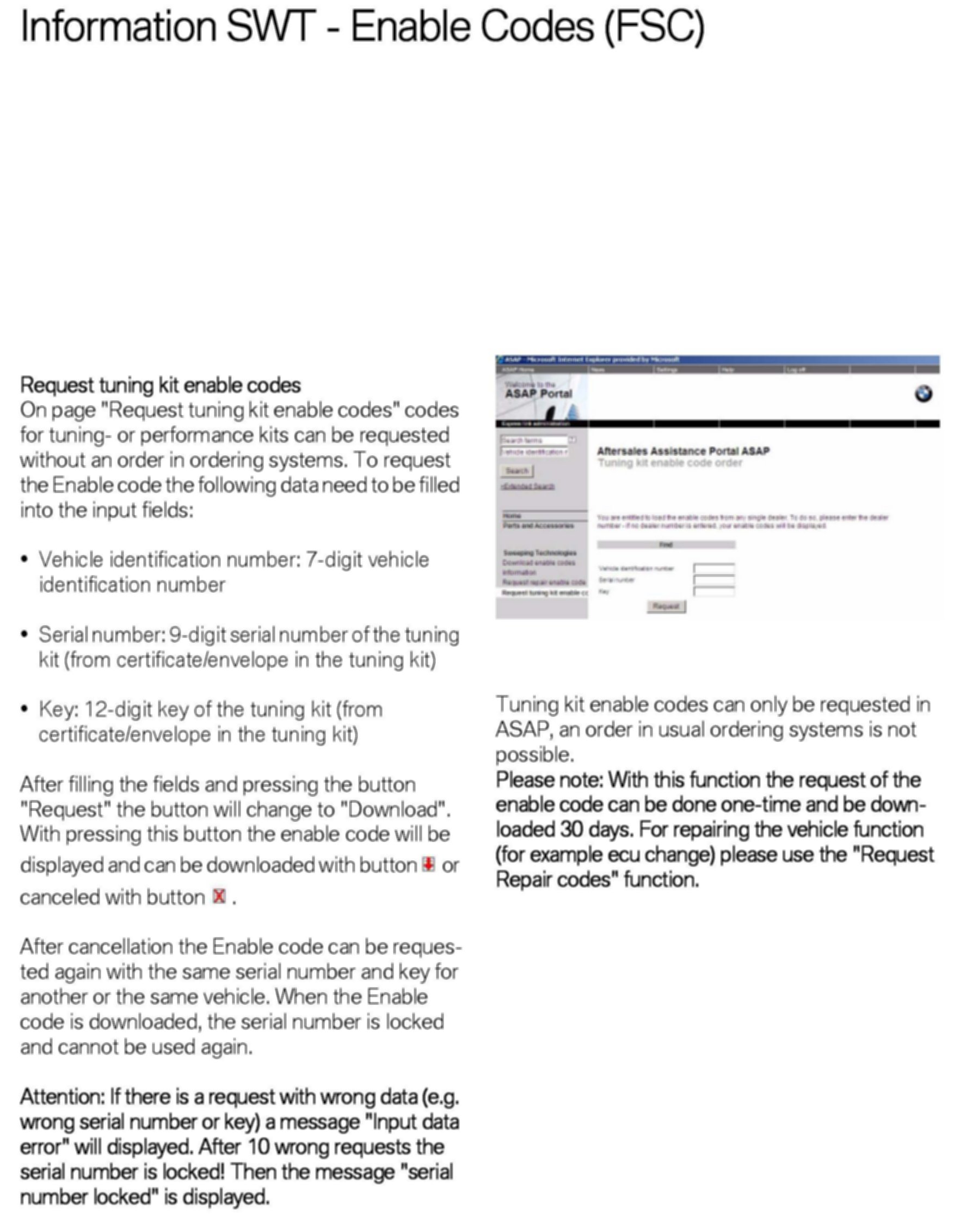 The abbreviation FSC stands for Freischaltcode, which is the German translation for Enabling Code. These codes are used to enable hardware or software in our vehicles to protect unauthorized access to various vehicle functions. These codes are ordered via the EPC and delivered through the Sweeping Technology system, SWT.