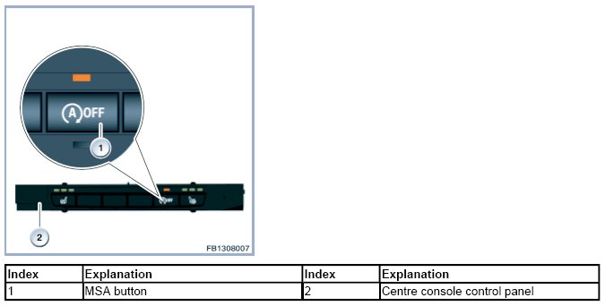 The MSA button (MSA OFF) in the center console control panel can be used to deactivate the MSA. The MSA is reactivated each time the electrical status of Terminal 15 changes (Terminal 15 OFF and then ON again) as well as when the MSA button is pressed repeatedly.