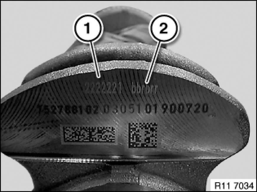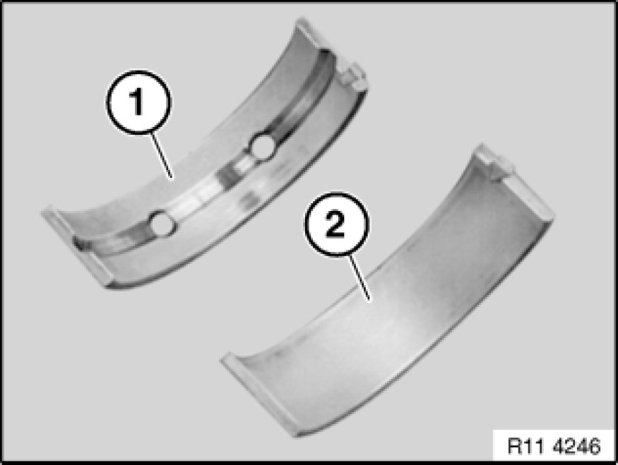 For bearing 1 with code letter A on the crankcase and code number 1 on the crankshaft bearing shell (1) with the color Yellow is required for the crankcase and bearing shell (2) with the color Yellow for the crankcase lower half (bedplate).