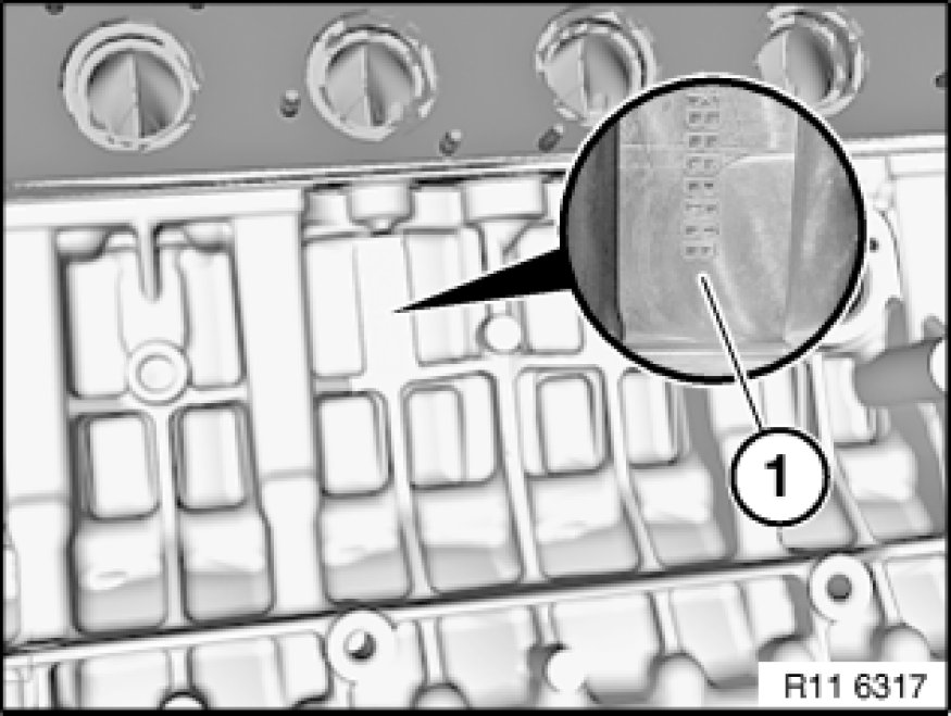 Main bearing classification (1) for crankcase lower half (bedplate), code numbers 1 2 3, see table.