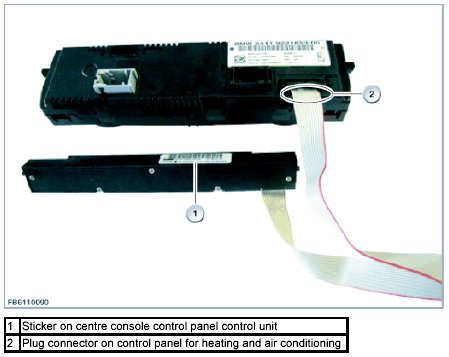The ribbon cable leading to the heating and air conditioning control panel at the control unit for the centre console control panel (SZM) can be defective. This fault occurs with particular frequency in components produced in the period between 09/2009 and 02/2010 (refer to sticker on control unit). These components were installed in vehicles manufactured up to production dates around 06/2010.