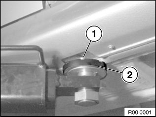 Align support plates (2) of lifting platform arms to jacking points (1) in such a way that no adjoining components are touched and thereby damaged.