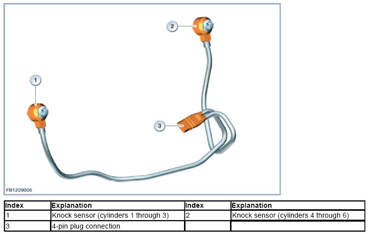 If multiple knock sensors are installed (e.g. with engine N55), the diagnostic function cannot detect and inadvertent mix-up of the two knock sensors. Installation of the knock sensors in the correct respective positions is of decisive importance for their correct operation. The length of the connecting cable and the distance to the cable connection identify the correct positions for the individual knock sensors. Ensure that the knock sensors are in the correct positions during installation.
