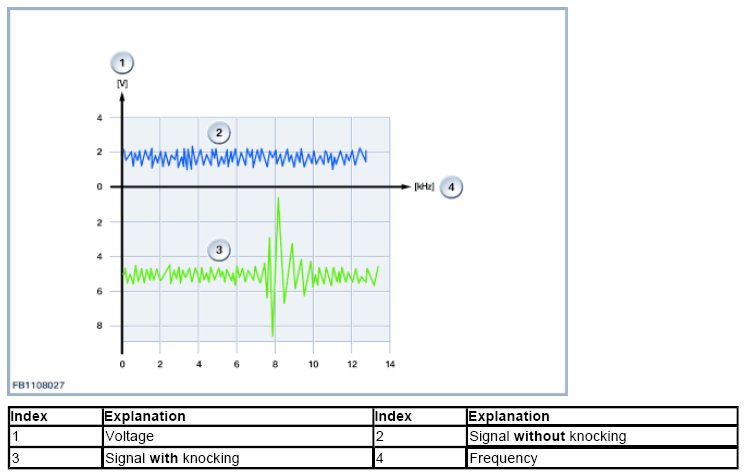 The knock sensor detects structure-borne noise within a frequency range extending from 5 to roughly 20 kHz. Engine knock generally occurs within an approximate frequency range of 7 to 16 kHz. The DME digital engine electronics system selects the ideal processing frequency for detecting combustion knock with reference to the following factors: