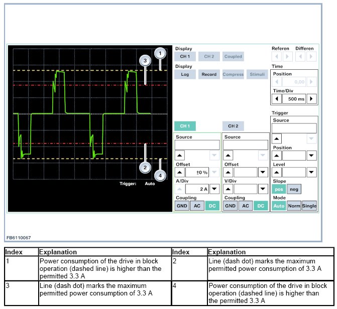 For evaluation of the characteristic curve, the measured power consumption of the central locking drive must be examined in block operation. The power consumption in block operation must not exceed 3.3 A.