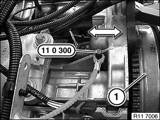 Rotate flywheel (1) at central bolt until firing TDC position at cylinder no. 1 is reached.