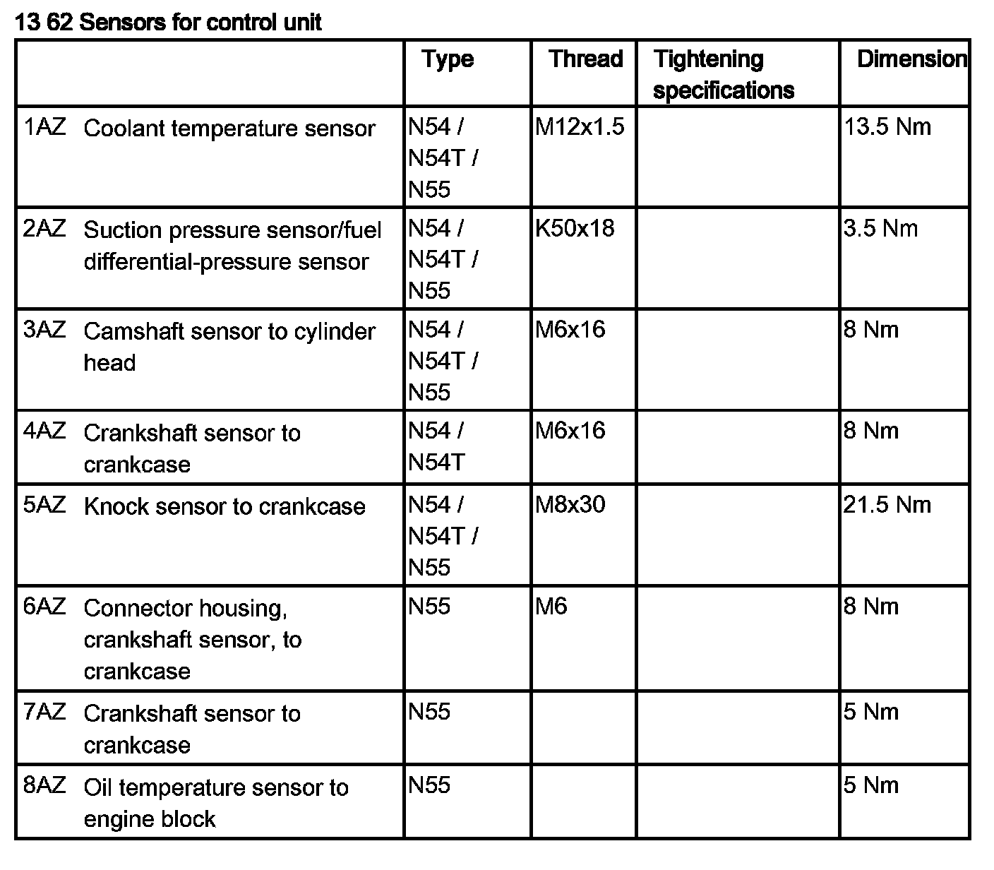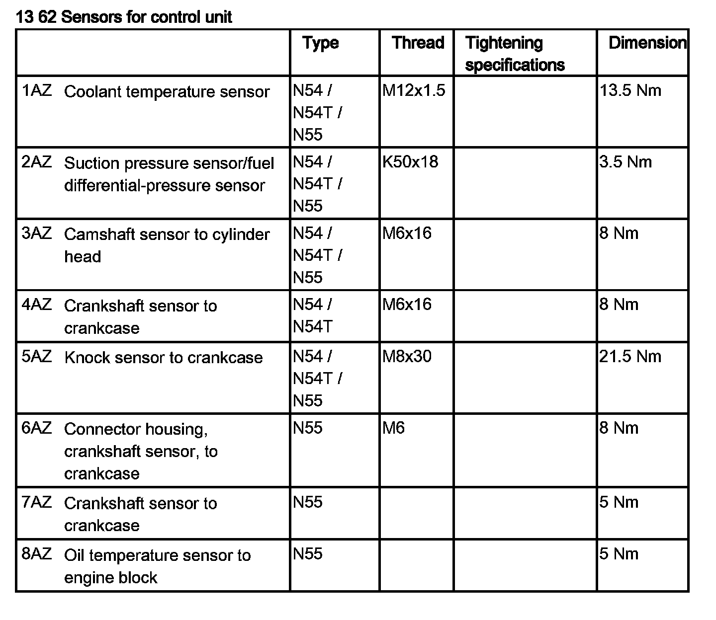 Tightening torque 13 62 7AZ.