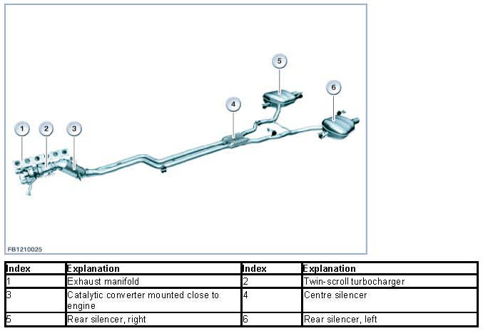 The following illustration portrays the exhaust system installed with the N55 engine on vehicles with one rear silencer.