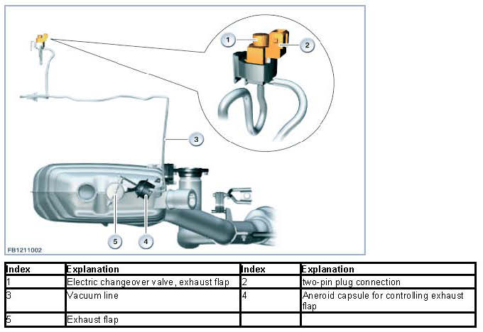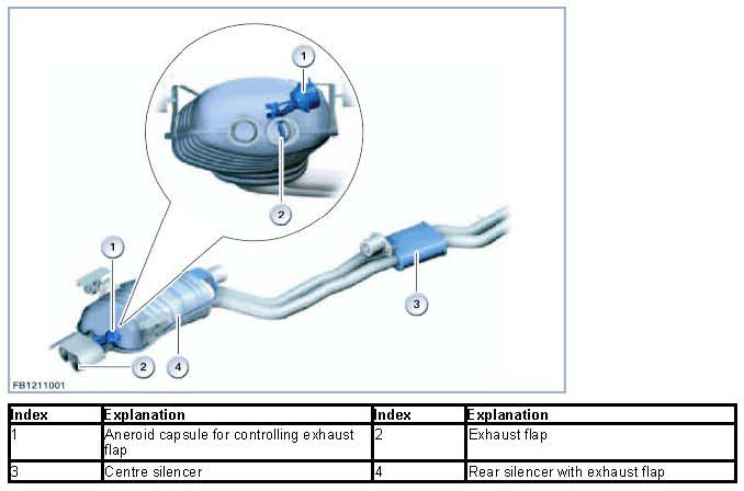 The exhaust flap installed in exhaust systems on vehicles with a single rear silencer varies according to specific model. The exhaust flap is controlled by the electric exhaust flap changeover valve.