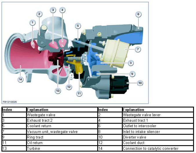 The following illustration shows the components of the twin-scroll turbocharger.