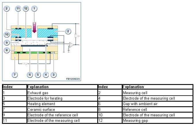 The oxygen sensor consists of a ceramic coating made of zirconium dioxide (laminated). The heating element inserted in the laminate rapidly ensures the required operating temperature of at least 750 °C. The oxygen sensor contains 2 cells, a measuring cell and a reference cell. The two cells are coated with electrode made of platinum.