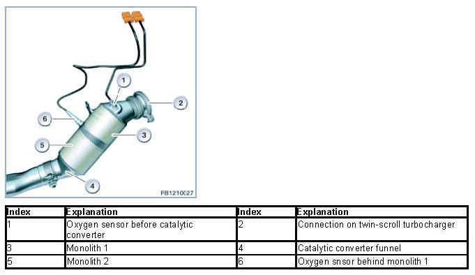 The 6-cylinder spark ignition N55 engine complies with EURO 5 emissions standards. Two oxygen sensors are installed to support the lambda closed-loop emissions control. One oxygen sensor serves as the control sensor and is mounted between the engine and the near-engine catalytic converter. The second oxygen sensor serves as a monitoring sensor in the near-engine catalyst (between monolith 1 and monolith 2).