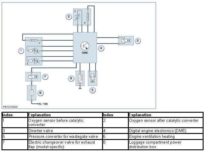 For complete and perfect combustion, an air/fuel ratio of 1 kilogram of fuel to approximately 14.7 kilograms of air is necessary. The air mass corresponds to around 11 cubic meters. The ratio between the air quantity that is actually being supplied and that required for a stoichiometric ratio is designated as lambda. During normal operation of the vehicle, the Lambda value fluctuates. The engine provides maximum performance operating with low air (lambda roughly 0.9 = rich mixture). The engine attains maximum fuel economy (minimal consumption) running on excess air (lambda of roughly 1.1 = rich mixture). The catalytic converter furnishes its best reduction of pollutant emissions with an air-fuel mixture in the range of lambda = 1. With modern catalytic converters the catalyst's conversion rate, meaning the proportion of pollutants that are actually converted, lies between 98 and almost 100 percent. Optimal composition of the air-fuel mixture is controlled by the DME digital engine electronics system. The oxygen sensors deliver essential information on the composition of the exhaust gas. The pre-catalyst oxygen sensor continuously monitors levels of residual oxygen in the exhaust gas. The fluctuating values for residual oxygen are relayed to the DME digital engine electronics system in the form of a voltage signal. The DME manipulates the fuel-injection system to correct the mixture composition. A second oxygen sensor is installed behind the catalytic converter (monitor sensor). The catalytic converter has a high oxygen storage capacity. This means there is only a little oxygen behind the catalytic converter. The post-catalyst oxygen sensor transmits a virtually constant (attenuated) voltage. With increasing age, the oxygen storage capacity of the catalytic converter declines. The post-catalyst sensor then responds with progressively more pronounced fluctuations in its lambda readings. This characteristic is exploited by a special diagnostic function employed to monitor the catalytic converter.
