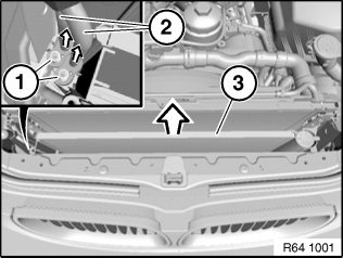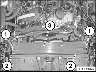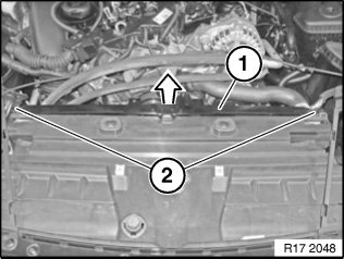 Unclip fan cowl (1) at clamps (2) on left and right, feed out in upward direction and loosen from cooler package cover.