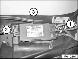 Make sure mount (1) and retaining lugs (3) of control unit for seat heating (2) are correctly seated.