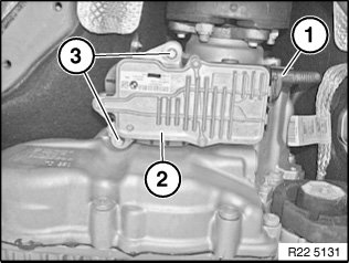 Release screws (3) and remove transfer box control unit (longitudinal torque module) (2).