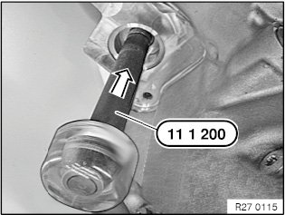 Drive radial shaft seal fully home using special tool 11 1 200 and plastic hammer.