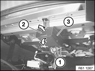 Open lock (2) in direction of arrow and remove control unit/module for seat heating (3) towards bottom.