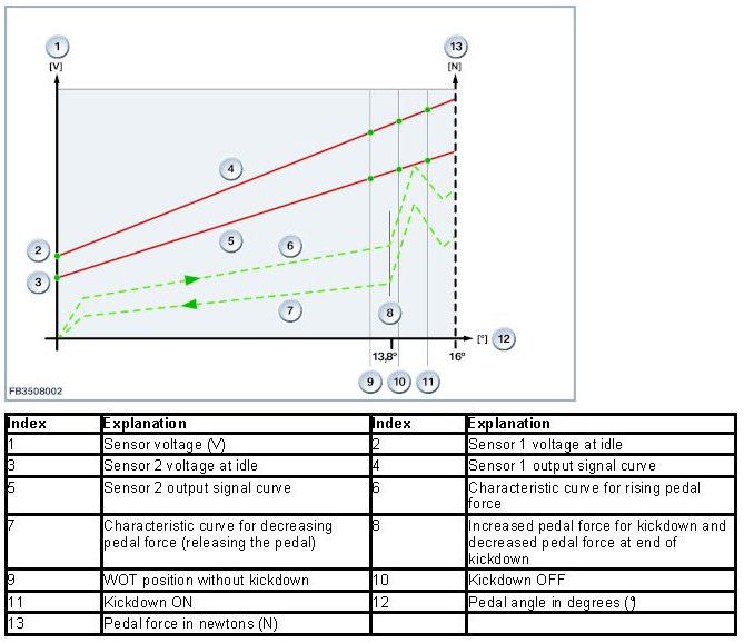 Start of kickdown phase: The detent position at which increased pedal force is required lies between a maximum of 13.8° and a minimum of 1.6° before the mechanical travel stop. On the characteristic curve, the threshold value for kickdown ON must be immediately after the point for maximum pedal force for initiating kickdown.