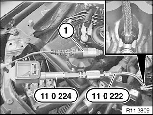 Screw special tool 11 0 222 by hand into spark plug thread and connect special tool 11 0 224.