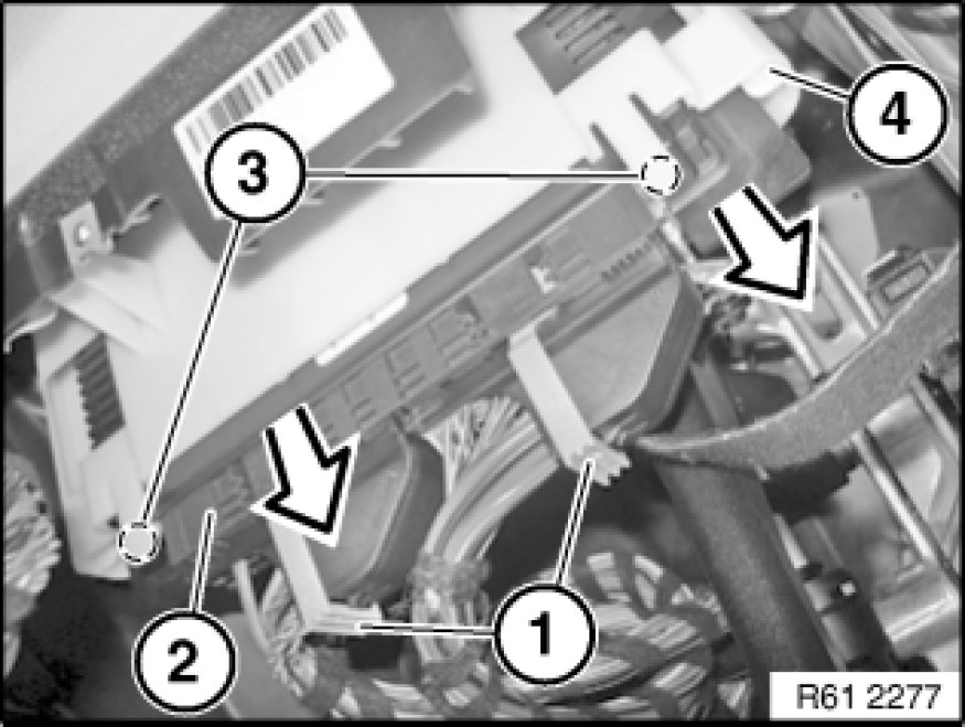 Carefully pull footwell module (2) out of device holder (4) in direction of arrow.