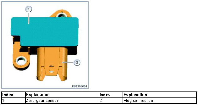 The zero-gear sensor is mounted on top of the gearbox housing. The zero-gear sensor detects the idle position of the gearshift lever.