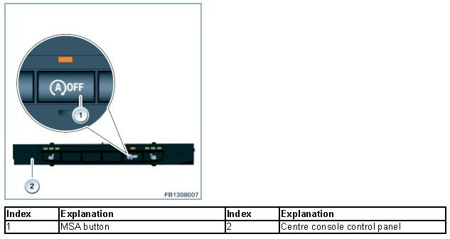 The MSA button (MSA OFF) in the center console control panel can be used to deactivate the MSA. The MSA is reactivated each time the electrical status of Terminal 15 changes (Terminal 15 OFF and then ON again) as well as when the MSA button is pressed repeatedly.