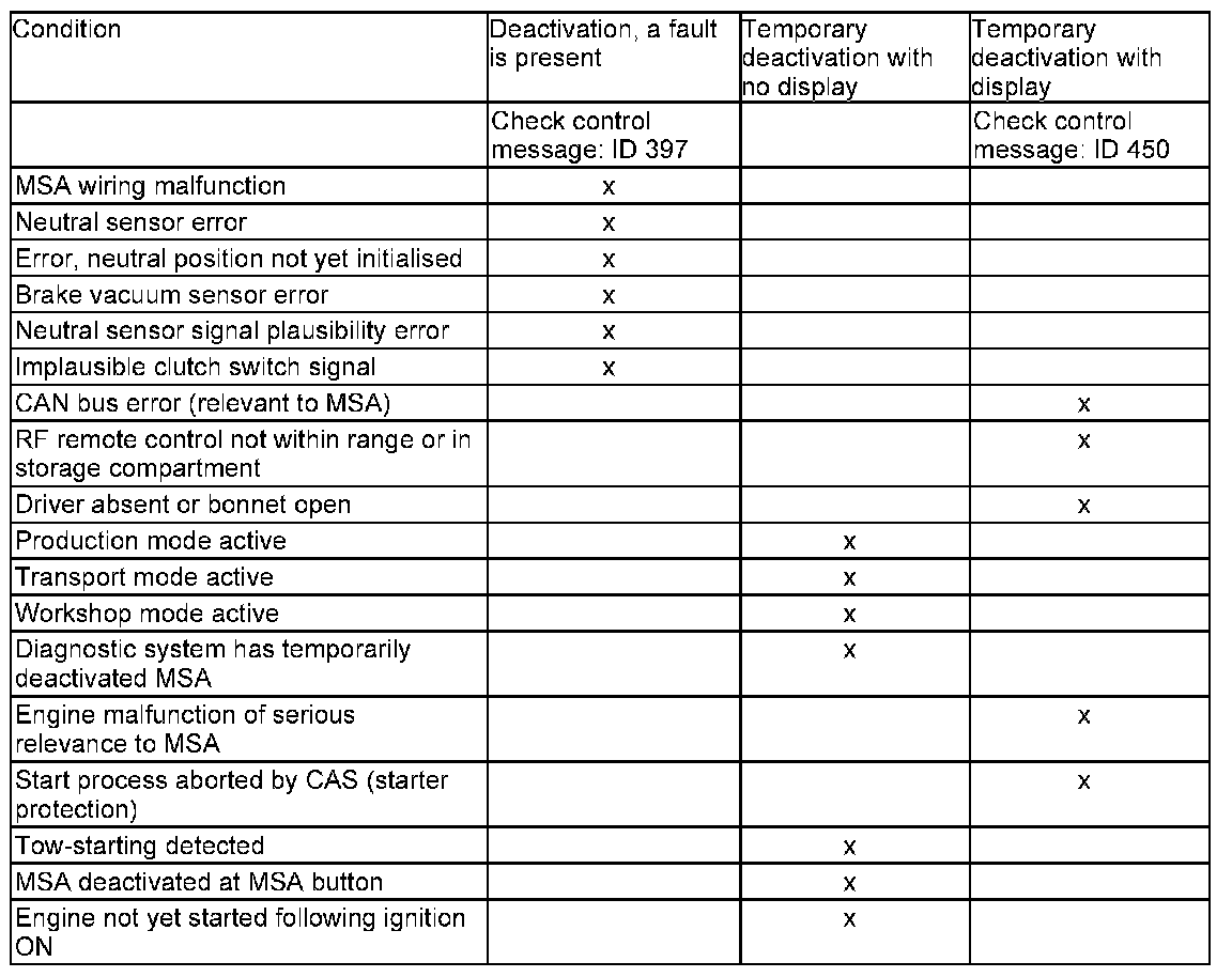 When faults (DTCs) related to the MSA are stored this leads to deactivation of the automatic engine start-stop function.