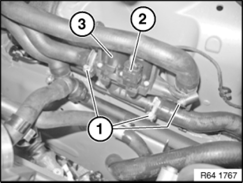 Release hose clamps (1) and detach coolant hoses.