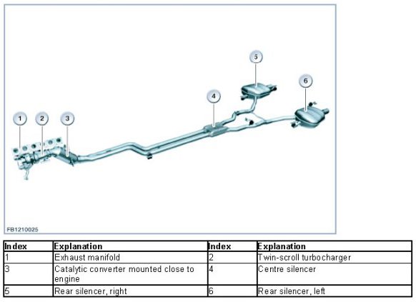 The following illustration portrays the exhaust system installed with the N55 engine on vehicles with one rear silencer.