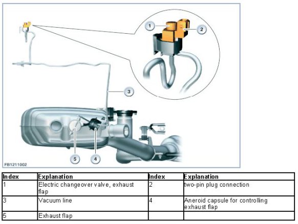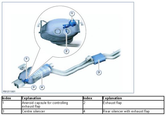 An aneroid capsule is mounted on the rear silencer's endpipe. The diaphragm box is linked to the exhaust flap via an adjustment mechanism. A vacuum hose leads from the exhaust flap's electric changeover valve to the aneroid capsule. When the engine is off no power is supplied to the exhaust flap and the exhaust flap is closed. Both conditions, open and closed, occur during normal vehicle operation.