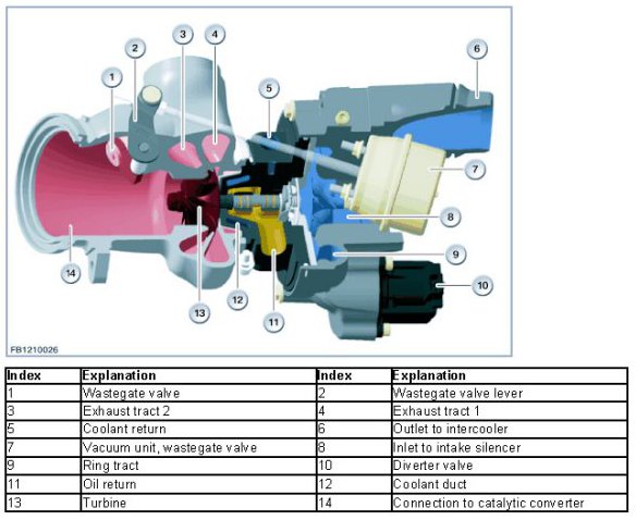 The following illustration shows the components of the twin-scroll turbocharger.