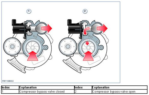 The compressor bypass valve opens to prevent intense oscillations in the impeller when the throttle valve is suddenly closed (for instance, during gear changes). The sets up a flow around the twin-scroll turbocharger. The compressor bypass valve prevents air from pulsating against the closed throttle valve.